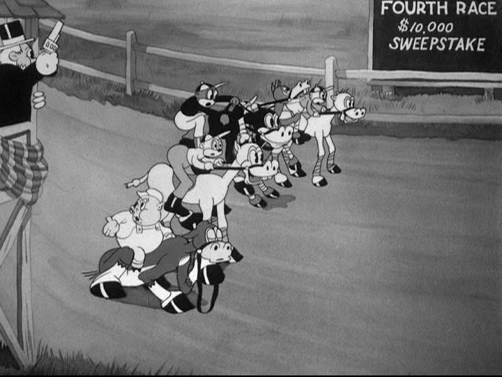 realizing it, the pair have entered themselves into a horse race!Porky's WTF expression, though poorly drawn, is priceless, as a caricatured African-American brings Dobbin into the lineup.