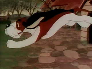 Willoughby asks us (informally): "Which way did they go? Where did the dogs go?" Avery's interpretation of Lon Chaney Jr's Lennie lacks that actor's gravelly undertones (which would grow more pronounced and phlegmatic through the 1940s) but gets the staccato phrasing and the repetition just right.Willoughby has a remarkably odd run-cycle, which will get maximal use in this longer-than-average Warner Brothers cartoon.