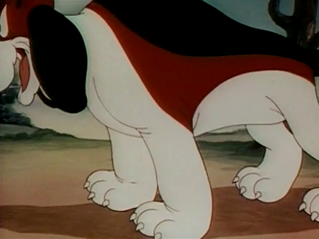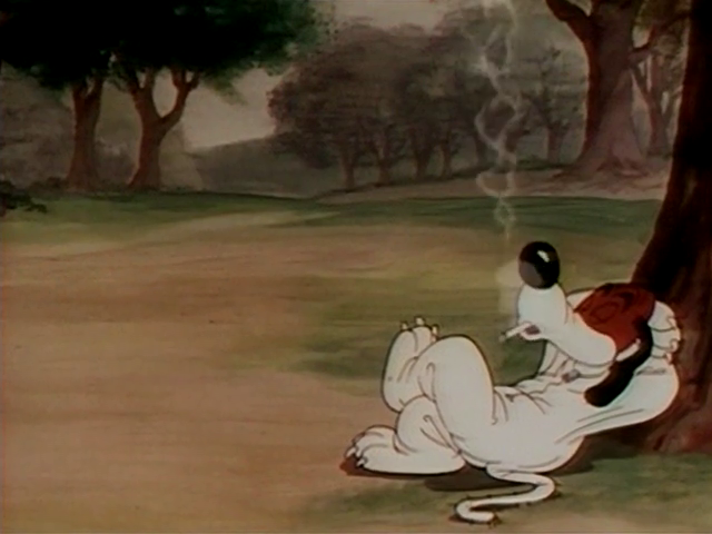 George anticipates much sport and gaiety. As Willoughby lumbers his way, he dons a generic dog costume. The get-up's headpiece reveals Avery's hand as an artist, and strongly anticipates the character designs of his M-G-M cartoons released in 1946-1947.