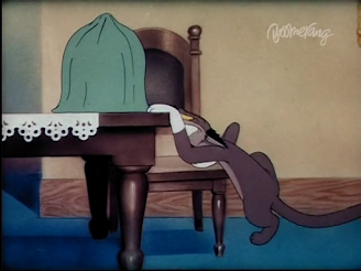 One can see the future of Avery cartoons in the ritualized efforts of the cat. I'm reminded of 1949's The Counterfeir Cat, '51's Cock-A-Doodle Dog and '52's Magical Maestro and Rock-a-Bye Bear. It's a comedy of futility similar to Chuck Jones', but more mechanized and stripped of emotion. You can't feel for Avery's characters, as you do for Wile E. Coyote or the wolf in the wolf and sheepdog cartoons. Their streamlined try/fails are bracingly funny, and the obsession in the face of overwhelming odds against them brings a comic gravity to the table that no other cartoon auteur could approach.