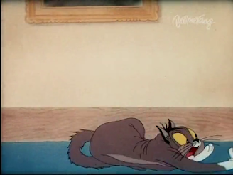 Some Clampett-esque distortion in this scene suggests that this scene might not have been fully mapped out by Avery before his walk-out. The rubbery comedy of the cat's grimaces and salivations has a lot more in common with Clampett's comedic world than Avery's.